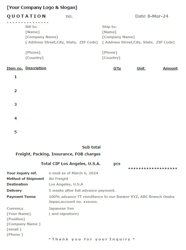 情報が整理できたら、それを英語の見積書フォーマットに当てはめていきます。